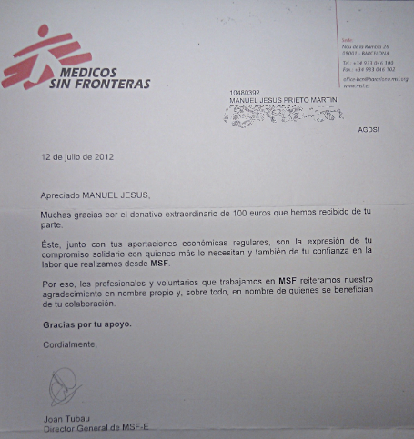 Como saben, todos los beneficios generados por el libro «Curistoria 2» en todos sus formatos, canales… están destinados a Médicos sin Fronteras. A medida que voy recibiendo las liquidaciones, voy haciendo transferencias a dicha ONG y en respuesta a las mismas suelo recibir una carta. La imagen que encabeza esta entrada corresponde a la última que he recibido y quería compartirla, ya que ese agradecimiento es para ustedes, que son los que comprando el libro hacen esto posible. Gracias.