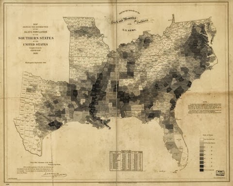 El mapa que encabeza esta entrada fue una ayuda importante para Lincoln durante la Guerra Civil. No es un mapa de tropas, ni nada similar que uno pudiera pensar como útil en la batalla, sino que era un mapa de censo. Concretamente mostraba la distribución de la población de esclavos en Estados Unidos.