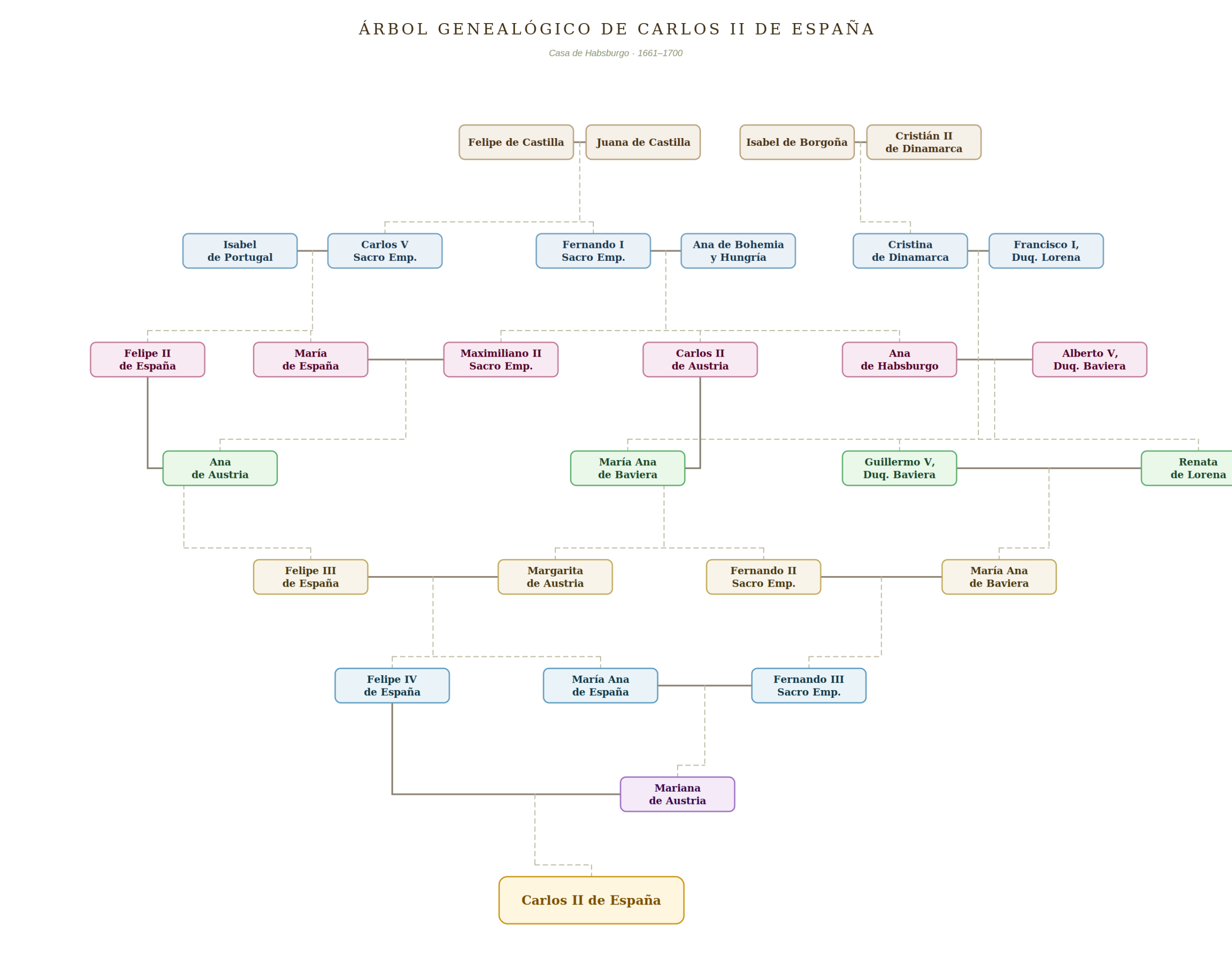 Que Carlos II de España estuvo acechado por las enfermedades toda su vida, parece un hecho. A pesar de ello fue capaz de ocupar el trono algo más de 35 años, lo que no es poca cosa. Eso sí, comenzó ese contador cuando tenía tan solo cuatro años. La imagen superior muestra el impresionante árbol genealógico de Carlos II de España. Está coloreado por generaciones (padres, abuelos…) y las líneas continuas indican un matrimonio, mientras que las discontinuas muestran quién es hijo de quién.